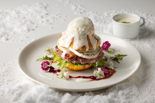 冬の山中湖をイメージした、雪化粧の富士山型バーガー。甲州ワインビーフの赤身パティに、2種のチーズとリンゴンベリージャム、ヨーグルトソースが織りなす、冬ならではの豊かな味わいをご堪能いただけます。クリーミーなクラムチャウダーを添えて、季節を感じる贅沢なひと皿に仕上げました。
