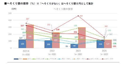 へそくり額の傾向が変化。2023年までは、女性>男性、不仲夫婦>仲良し夫婦の構図が、今回の調査では差が縮小した。