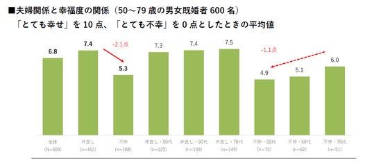 - 年代別に見ると、仲良し夫婦の幸福度は年代による差がほとんどなかったのに対し、不仲夫婦では年齢が若いほど幸福度が低下する結果となった。