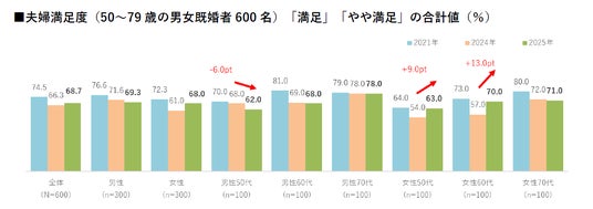 夫婦関係に50代以上の7割近くが満足しており、前年から2.4ポイント上昇しました。特に50代、60代女性で顕著な伸びを見せています。コロナ禍から昨年まで「女性の方が夫婦関係にシビア」という傾向でしたが、それを覆す兆しが見えました。