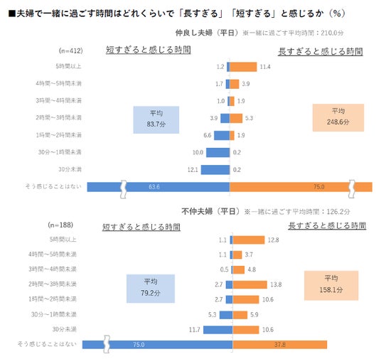 - 仲良し夫婦が「長すぎる」と感じる平均時間は平日で平均248.6分(約4時間)、不仲夫婦は158.1分(約2.5時間)と90.5分(約1.5時間)の差があり、逆に「短すぎる」と感じる平均時間は仲良し夫婦で83.7分、不仲夫婦は79.2分と仲良し夫婦の方がやや長かった。