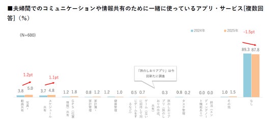 夫婦間のコミュニケーション手段は、LINE・LINEの電話が増加。一方で、メール・ショートメールは微減。情報共有アプリ・サービスの利用率は約1割