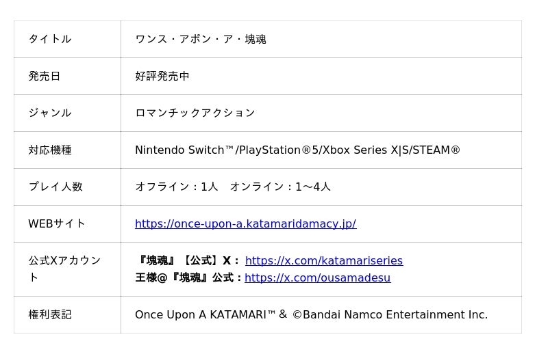 株式会社バンダイナムコエンターテインメントは、Nintendo Switch(TM)/PlayStation(R)5/Xbox Series X|S/STEAM(R)にて好評発売中の 『ワンス・アポン・ア・塊魂』 につきまして、