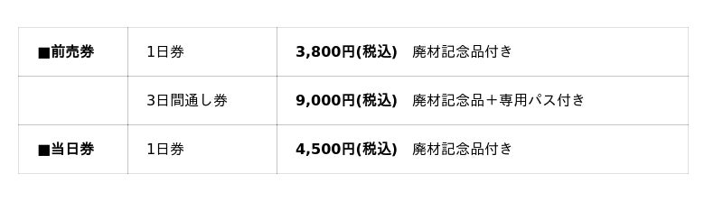 今回もチケット購入者全員に、テラス崩壊時の廃材を切り出した記念品を会場でプレゼントします。また、3日間の通し券もご用意しています。“おトク”な通し券、お見逃しなく。