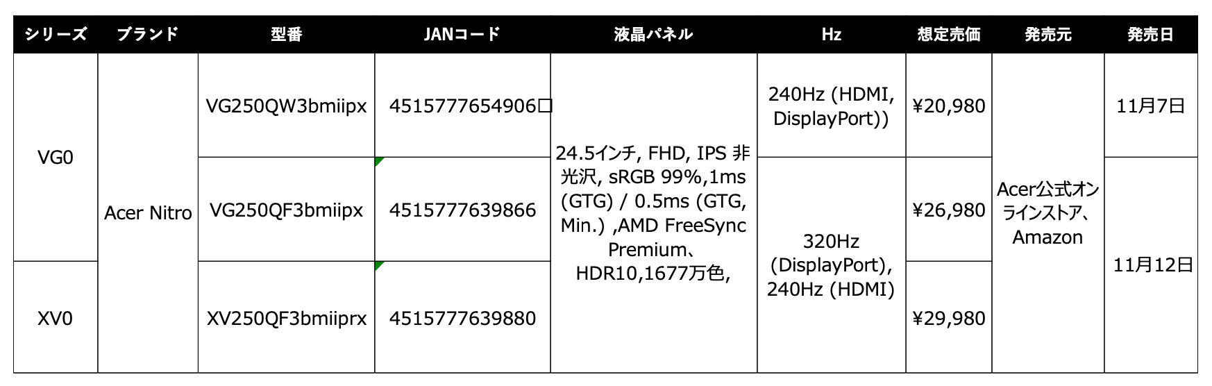 日本エイサー株式会社(本社:東京都新宿区、代表取締役社長:ボブ・セン)は、FPS、格闘、アクションゲームのプレイを通して、リフレッシュレートを重視するPCゲーマーに向けて、AcerのゲーミングブランドNitro(ニトロ)ブランドより、フルHD・リフレッシュレート240Hz-320HzのIPSパネルを搭載した24.5インチゲーミングモニター「VG250QW3bmiipx」「VG250QF3bmiipx」「XV250QF3bmiiprx」の計3機種を、Amazon、Acer公式オンラインストア、Acerダイレクト(楽天市場・Yahoo!ショッピング)にて発売いたしました。