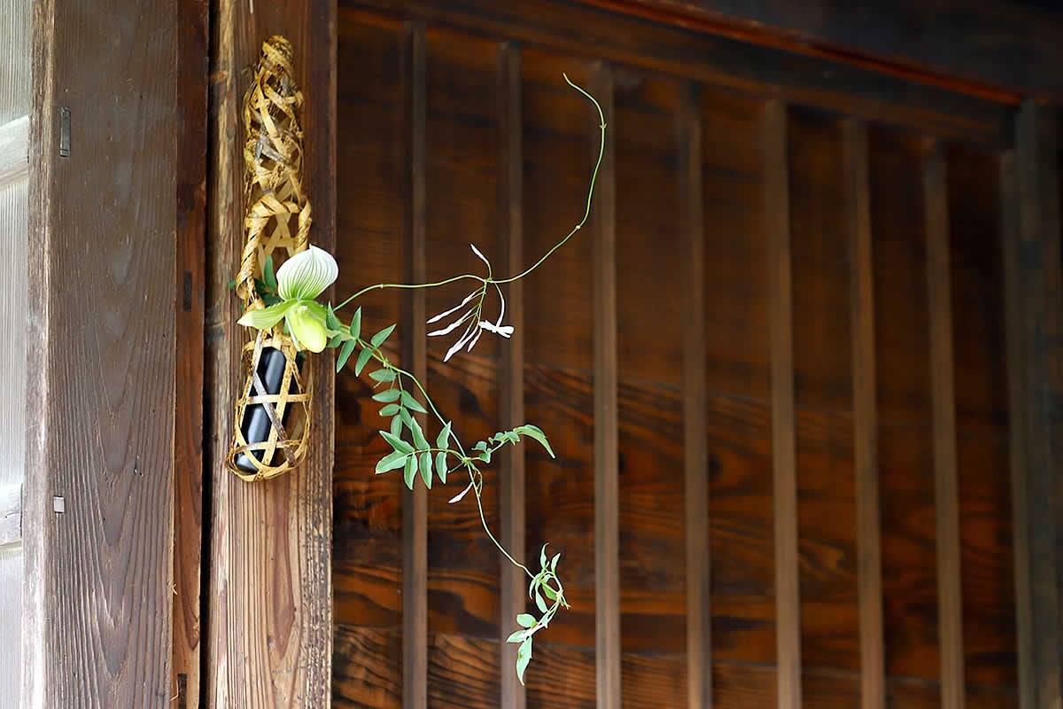 「虎竹掛け花籠 ちまき」は、日本唯一の虎斑竹(とらふだけ)の魅力を活かし、職人の手仕事により一点一点丁寧に編み上げた逸品です。壁や柱に吊り下げて季節の草花や枝物を飾ることで、和の趣と自然のやさしさを室内に取り込むことができます。