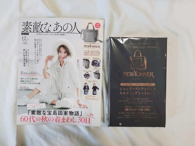 雑誌『素敵なあの人』12月号の付録は、NEWYORKER(ニューヨーカー)のショルダーストラップつき「キルティングトートバッグ」です。