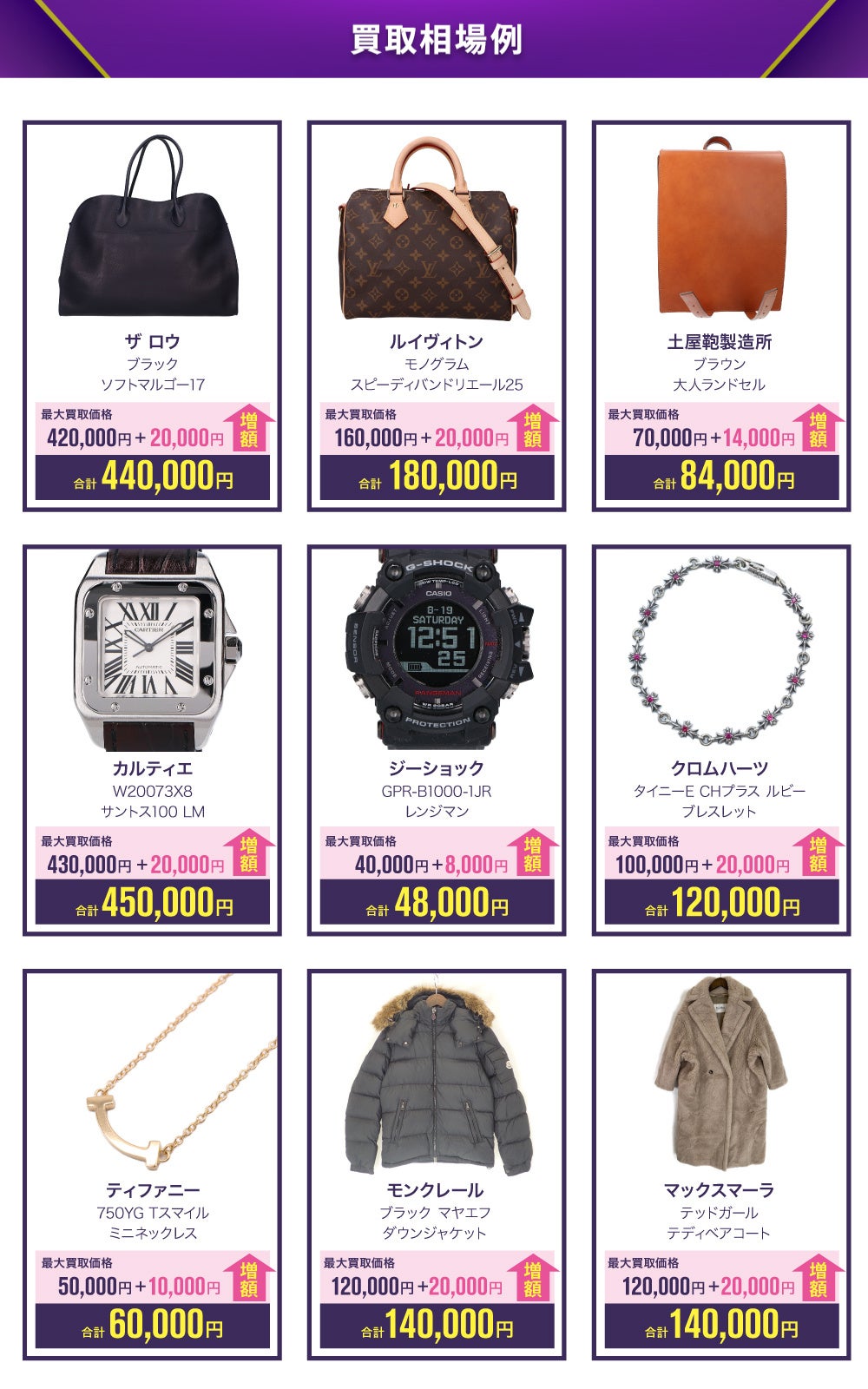 この期間中、1点あたり1万円以上の査定額がついたお品物を対象に、自動で最大2万円までの増額を行います。