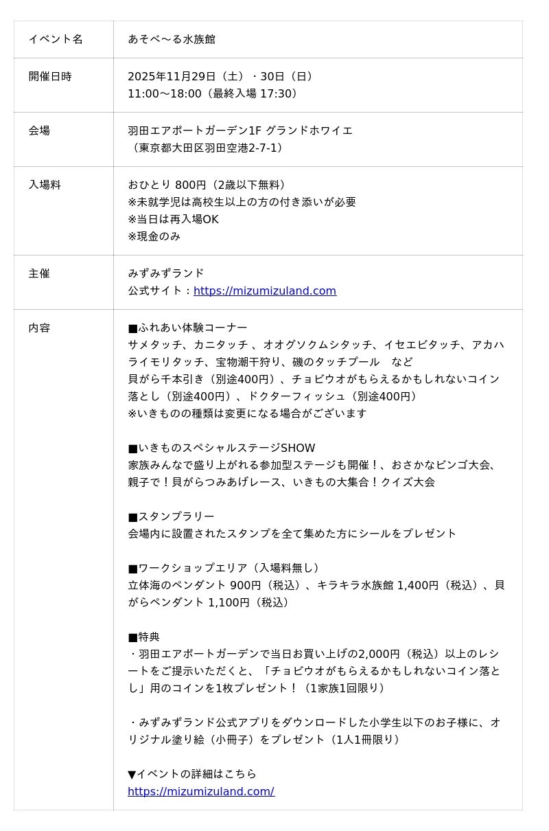 住友不動産商業マネジメント株式会社(本社:東京都新宿区、代表取締役社長:山本 直人)が運営する、羽田空港第3ターミナル直結の複合施設「羽田エアポートガーデン」(所在地:東京都大田区)では、2025年11月29日(土)・30日(日)の2日間、水族館イベント「あそべ~る水族館」を開催いたします。