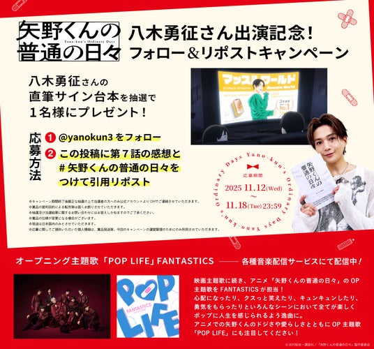 八木勇征さんの出演を記念してサイン入り台本プレゼントキャンペーンがスタート!!公式Xをフォローし、対象のポストを、第7話の感想と #矢野くんの普通の日々 をつけて引用リポストでご応募できます!ぜひ作品への感想とともにご応募ください!!