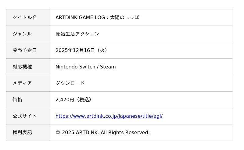 株式会社アートディンクは、Nintendo Switch(TM)、Steam(R)にて「ARTDINK GAME LOG:太陽のしっぽ」を2025年12月16日(火)に発売することを発表いたしました。