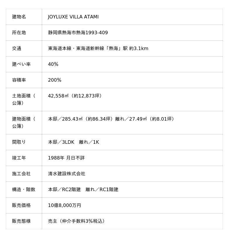 本物件は、相模湾から太平洋の水平線、初島、大島を望む眺望を全ての部屋から楽しめる海岸線に立地しています。都心からも車で1時間半、新幹線で約35分とアクセスの良い熱海は、近年、都市部在住の感度の高い若年層、国内富裕層および訪日外国人旅行者からリゾート地として再び注目されているエリアです。