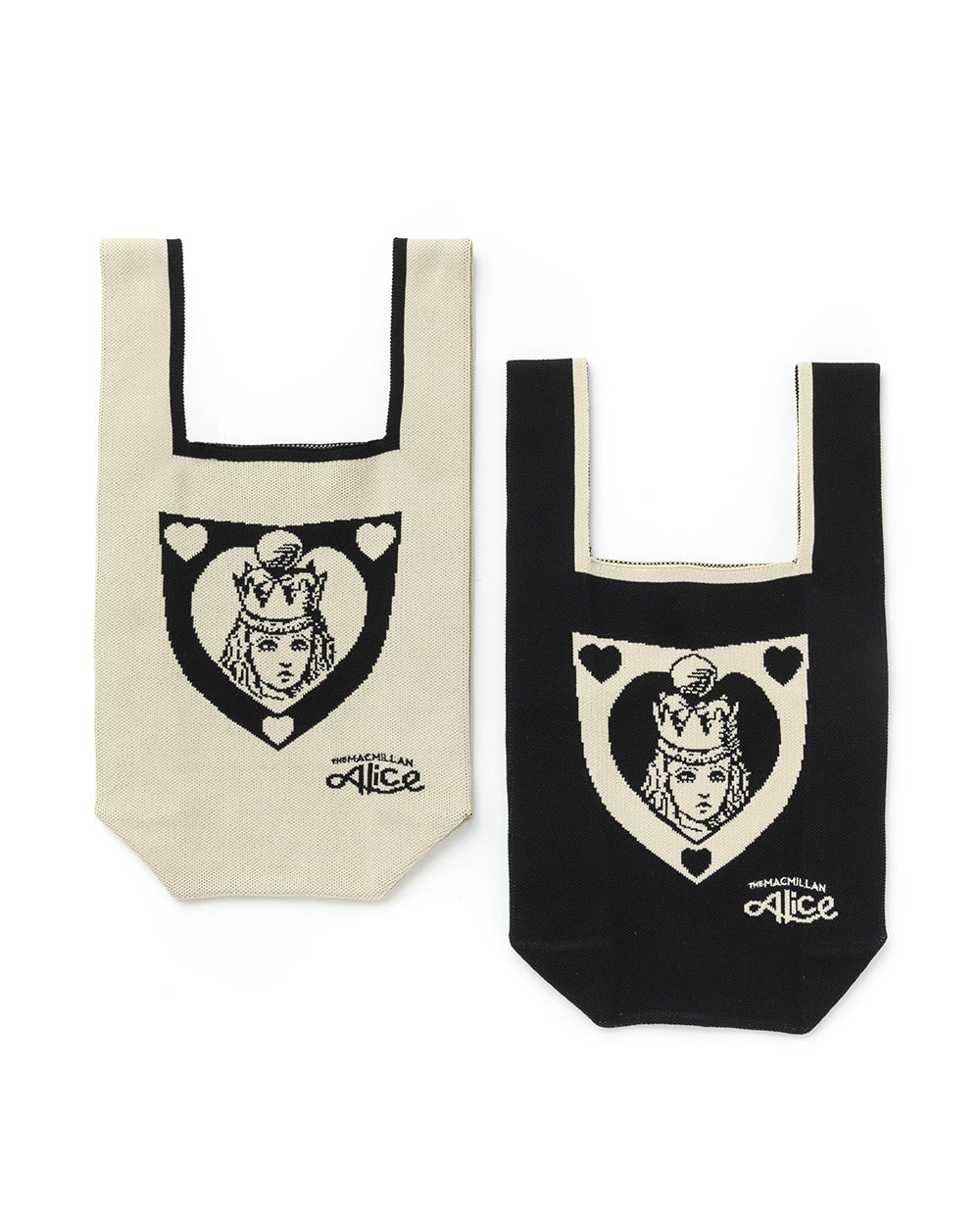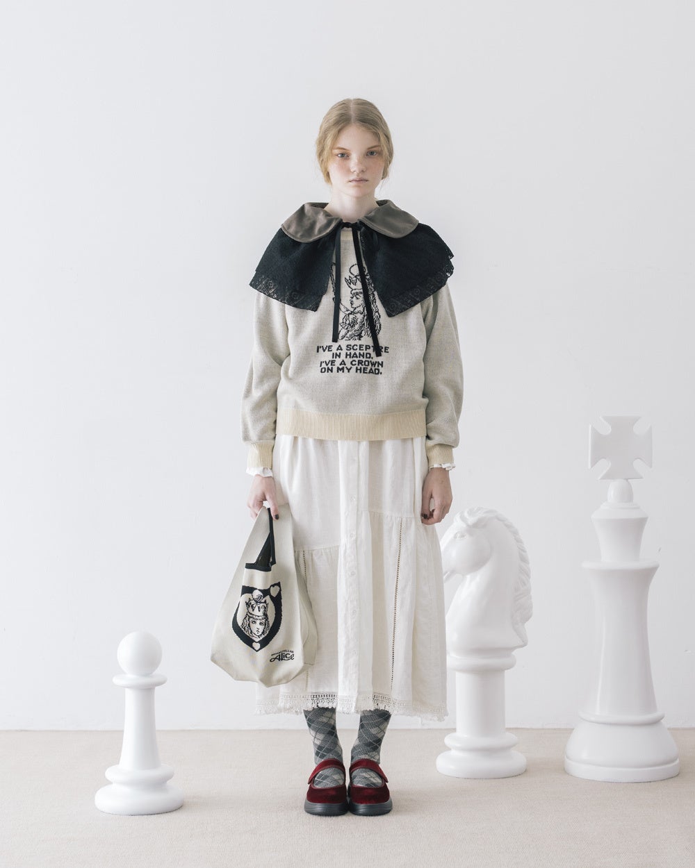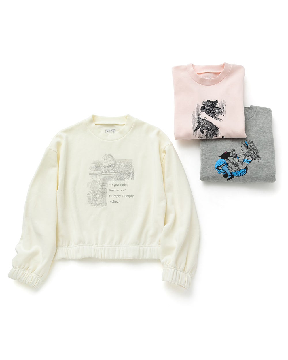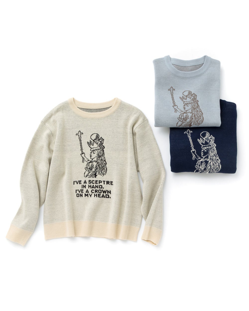 また、作画のイラストを刺繍とプリントで組み合わせたスウェットとチェスの女王になったアリスをジャカード織りで描いたニットもラインナップ。