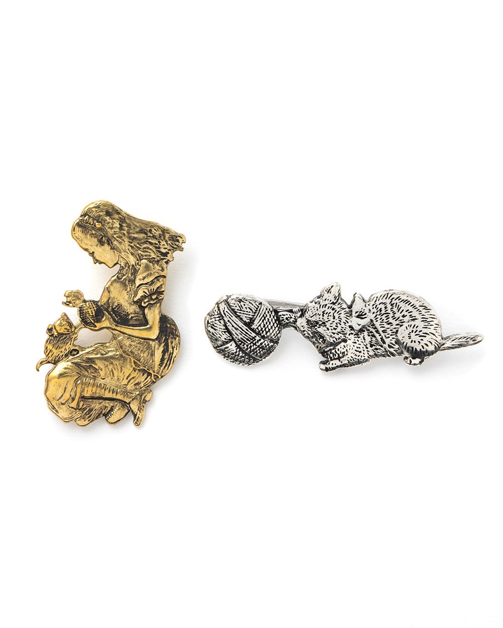 そのほか、作中に登場するアリスと猫をモチーフにしたブローチや、本に見立てたベロアのポーチ、ジャカードニットとお揃いのバッグ、3種のアソート柄ソックスも取り揃えております。
