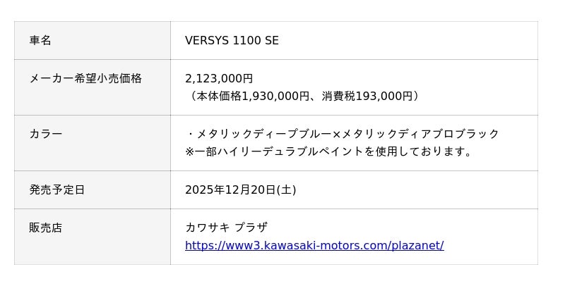 株式会社カワサキモータースジャパン(本社:兵庫県明石市、代表取締役社長:佐伯 健児)は、「VERSYS 1100 SE」のカラー&グラフィックを変更し、2025年12月20日(土)に発売いたします。