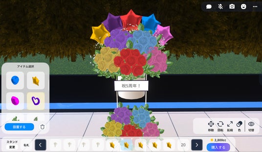 本機能は台座・装飾パーツ・メッセージを自由に組み合わせ、自分だけのフラワースタンドをデザインできるバーチャル空間ならではの推し活体験ができる機能です。作成は無料で、「外観エリア」内に設置されたバーチャルフラワースタンド作成エリアにて、どなたでもご利用いただけます。ファンの皆さまからのお祝いや応援の気持ちを込めた、オリジナルのフラワースタンドをぜひご制作ください。