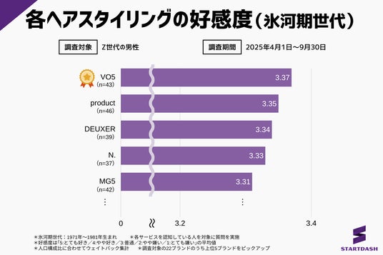 調査の結果、氷河期世代で最も好感度が高かったのは『VO5』で3.37でした。2位の『product』(3.35)、3位の『DEUXER』(3.34)と続いており、上位ブランドは僅差で並んでいます。