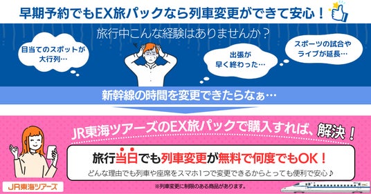 ★ 乗車直前まで新幹線の時間変更が無料で何度でも可能なのは、EX旅パックだけ!