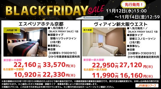 株式会社ジェイアール東海ツアーズ(本社:東京都中央区、以下JR東海ツアーズ)は、2025年11月14日(金)から12月1日(月)まで開催する「BLACK FRIDAY SALE」の一般発売に先駆け、LINEアカウント連携をしていただいている方を対象に、11月12日(水)13時から11月14日(金)12時59分までの期間限定で、先行発売いたしました。1月以降の「新幹線+ホテル」を使った旅行をいち早く予約できるチャンス!コスパ重視のホテルから憧れのラグジュアリーホテルまで多彩なラインナップ!一年に一度のお祭りセールで新幹線旅行をおトクに先取りできるこの機会をお見逃しなく!