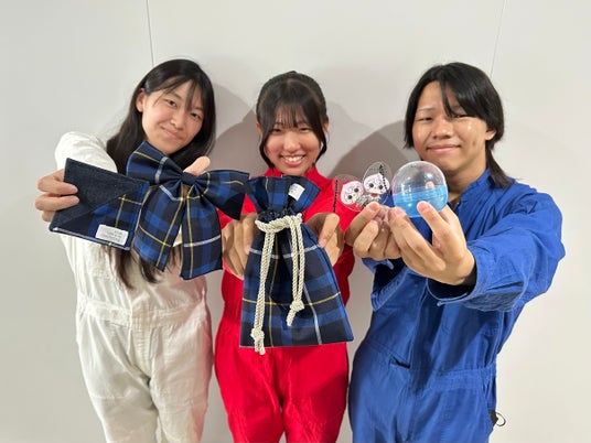 布雑貨敬愛高校の制服生地(KEIAIタータン)を児島デニムの生地を使用してリメイクしました。オリジナルキャラクターの「ももいちグッズ」も販売します。