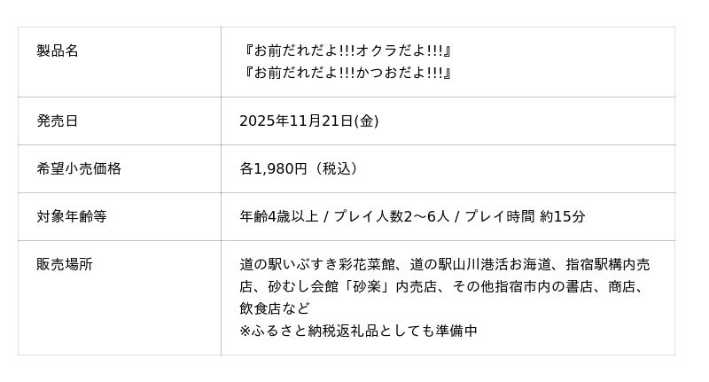 合同会社Yubiyadoのゲームスタジオ「ユビヤドゲームス」が、笑いながら指宿の店舗名を覚える新感覚カードゲーム『お前だれだよ!!!オクラだよ!!!』『お前だれだよ!!!カツオだよ!!!』を発売