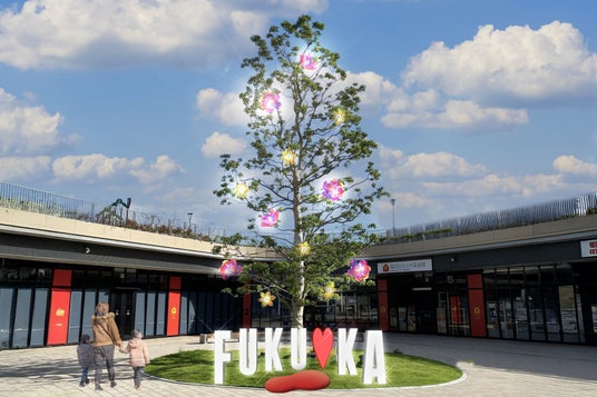 - 福岡ならではの明太子をイメージしたオリジナルベンチと昼と夜で表情が変わるシンボルツリー