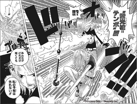 ナミがカリファとの戦闘で技を放った印象的なシーン。白い線が走る特徴的な書体、画面に飛び交う大小の効果音の描き文字によって、目で音を聴いているかのよう。印判サイン入り。
