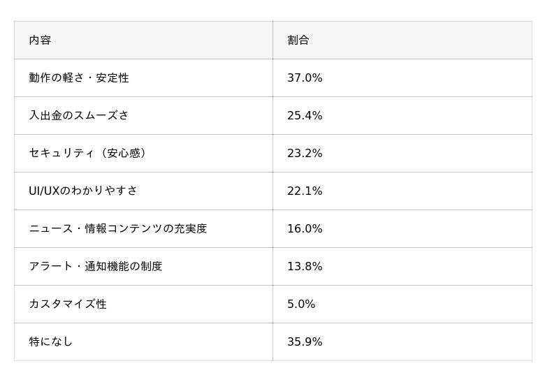 ・アプリで主に利用されている機能は「チャート閲覧」(56.4%)が最多で、「売買注文(現物)」(35.9%)が続いた。改善してほしい点としては「動作の軽さ・安定性」(37.0%)や「入出金のスムーズさ」(25.4%)が挙げられた。