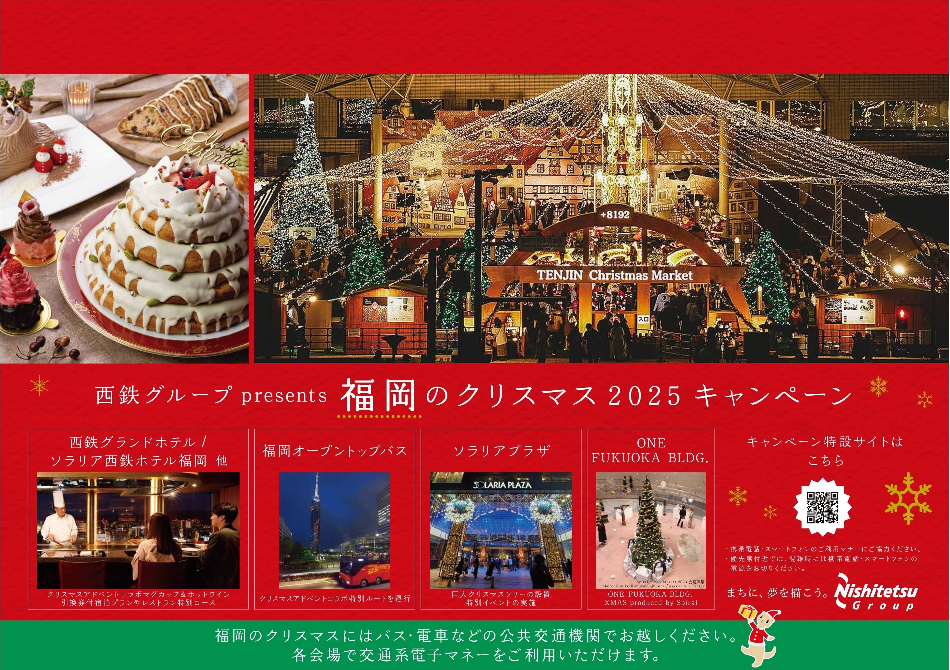 西鉄グループでは、11月12日(水)から12月25日(木)の期間中、「福岡のクリスマスへ行こう!2025」キャンペーンを実施します。「クリスマスアドベント※」と連動した商品・サービスをお客さまに提供し、西鉄グループ内外の企業連携を通して観光プロモーションを行うなど、クリスマスでにぎわうまちをさらに盛り上げ、福岡県内外からの観光需要創出に取り組みます。