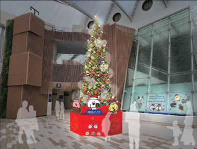 高さ約6mのツリーには、パントビスコさん描き下ろしのマリンワールドの仲間たちとぺろちの仲間が楽しそうにクリスマスを盛り上げます。
