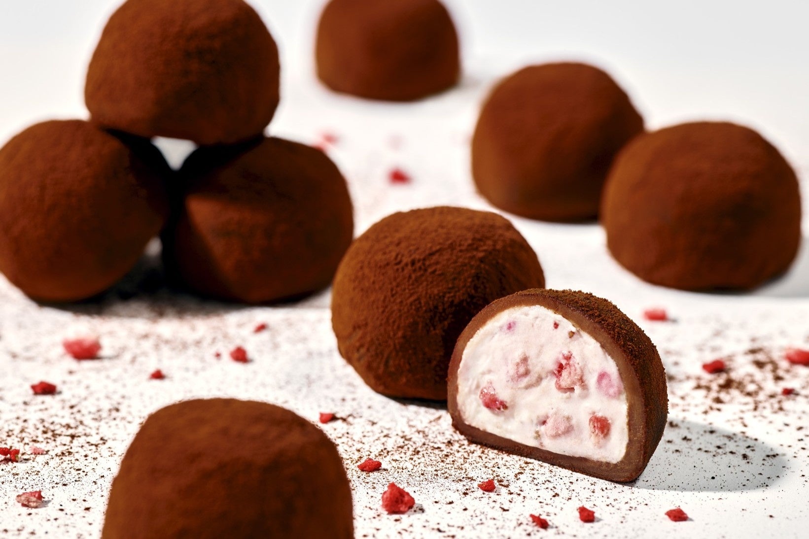 生クリームに爽やかなイチゴを加え、生チョコレートで包んだ