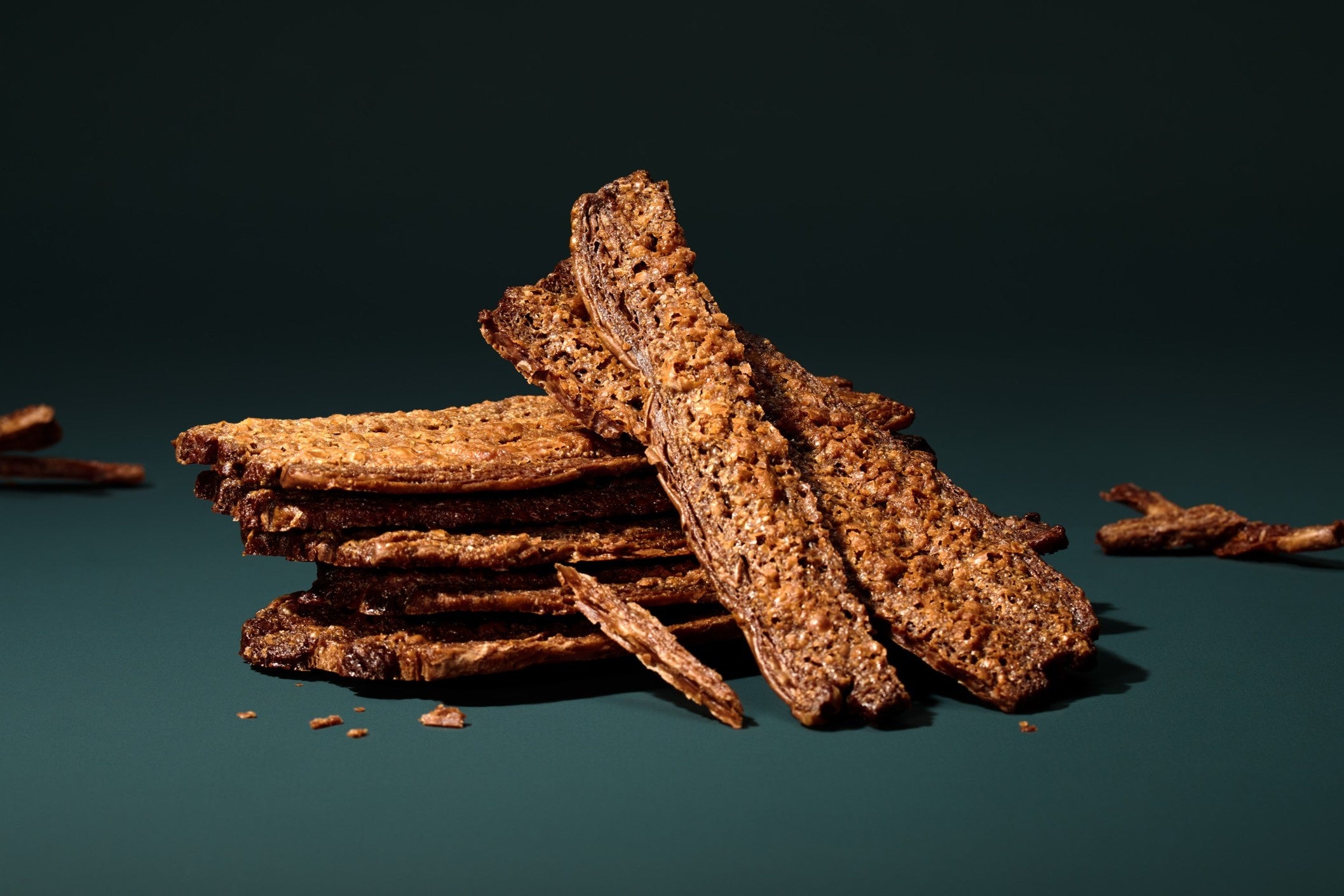 カカオの豊かな風味が広がる、一度食べたら忘れられない粉雪のような口どけのスノーチップス。1.生地に練り込んだチョコレート、2.チップスに噴霧したチョコレート、