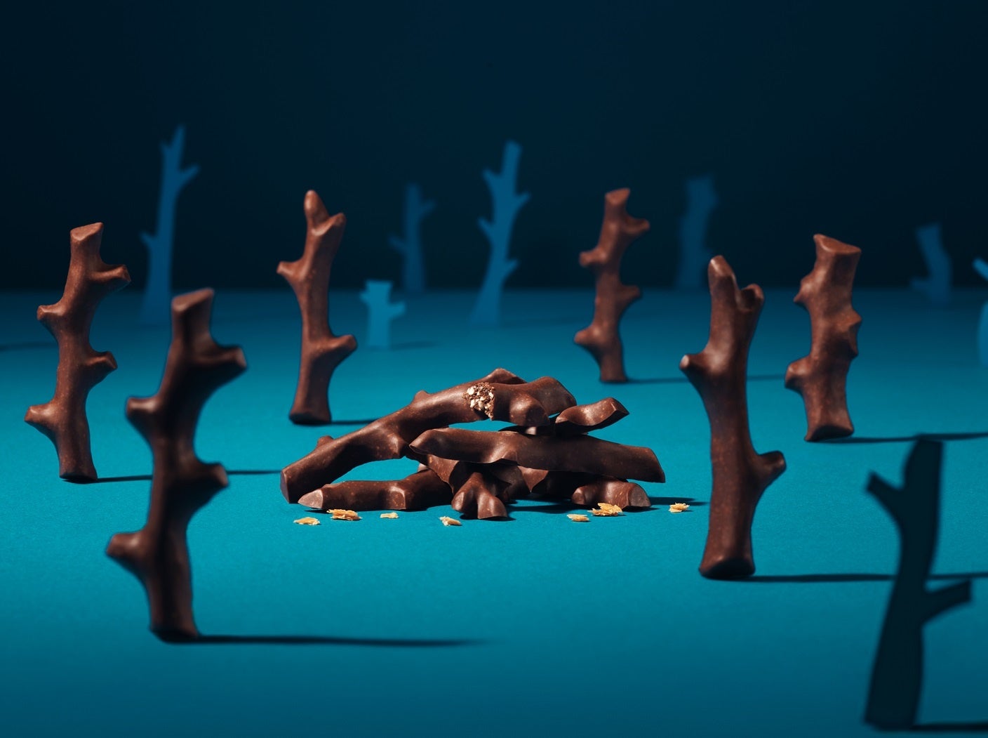 薄く焼いたクレープ生地を砕いたフィアンティーヌと、ローストアーモンドを細かく刻み、香ばしいパイを混ぜ込んだ、サクサク食感も楽しめるクリスピーチョコレートです。ミルクチョコレートとスイートチョコレートの絶妙なブレンドでミルキーな味わいをお楽しみいただけます。版画家 大谷一良さんの作品「森の見る夢」の木々をモチーフにした3つの形のチョコレートが特徴です。