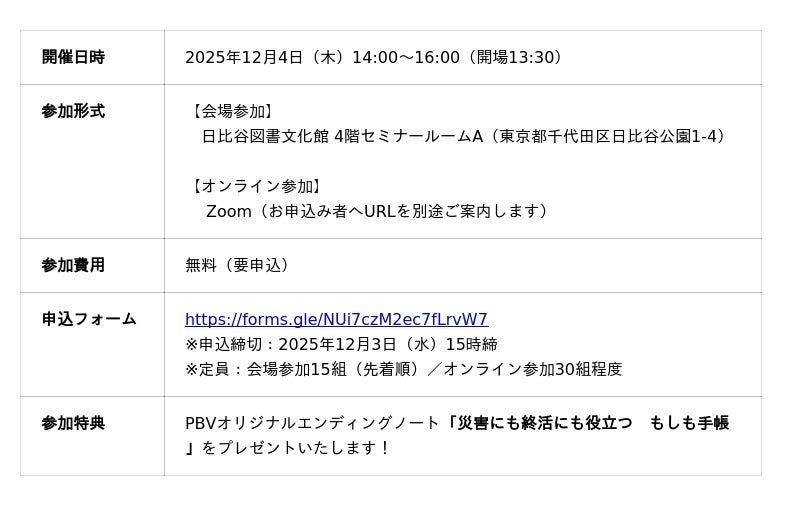 公益社団法人ピースボート災害支援センター(PBV、東京都新宿区)は、2025年12月4日(木)に、相続対策と遺贈寄付に特化した無料セミナーをオンラインおよび会場(日比谷図書文化館)にて開催します。