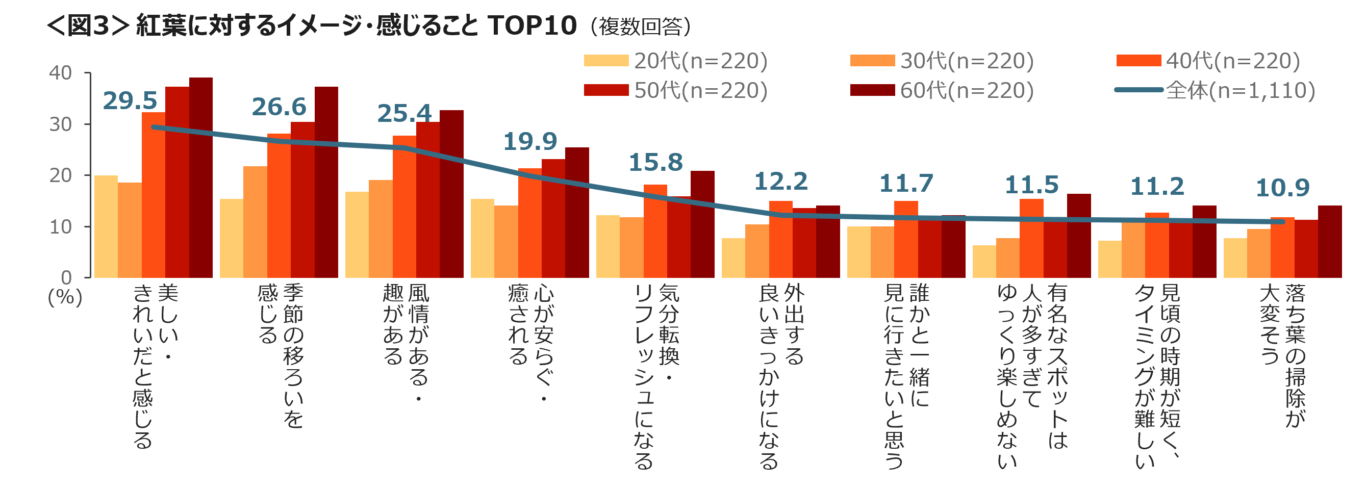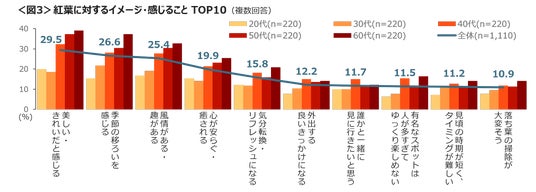紅葉に対するイメージ・感じていることは、「美しい・きれいだと感じる」「季節の移ろいを感じる」「風情がある・趣がある」が2割台でTOP3。