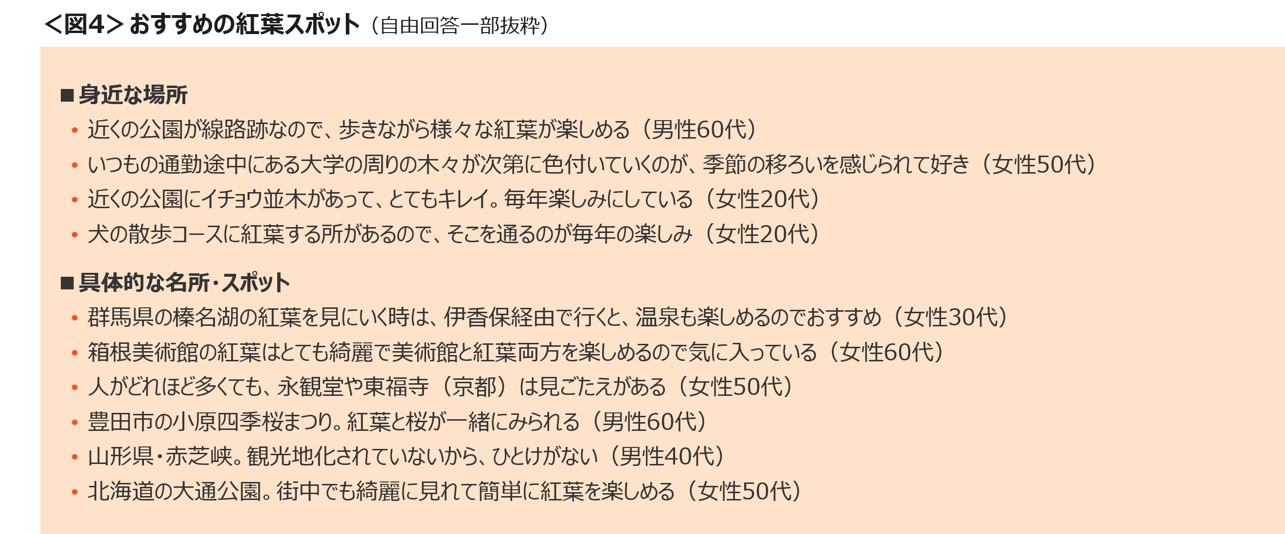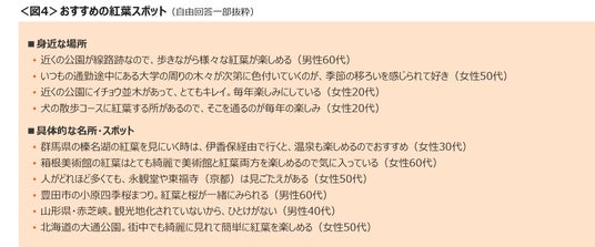 おすすめの紅葉スポットは、「近所の公園」や「散歩コース」、「通勤路」など身近な場所に関する回答が多く見られた。有名な観光地へ遠出しなくても、日常生活の中で季節の移ろいを楽しむといった声も散見された。<図4>
