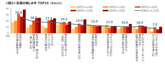 楽しみ方は、「近所の公園や並木道を散歩」(26.8%)が最も高く、次いで「お寺や神社、城などの歴史的建造物と一緒に楽しむ」「ドライブやツーリングで車窓から眺める」「有名な紅葉スポットに出かける」が続く。