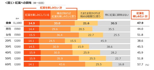 女性や、年代が上がるにつれ紅葉への興味も高まる。20代では「特に興味はない」が45.9%で関心が低い。<図1>