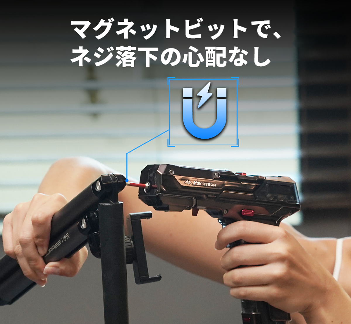 ドライバーとビットにはマグネットを搭載します。ネジをしっかり保持して落下を防ぎ、ビット交換も早い。スムーズな操作で、作業効率を大幅に向上させます。
