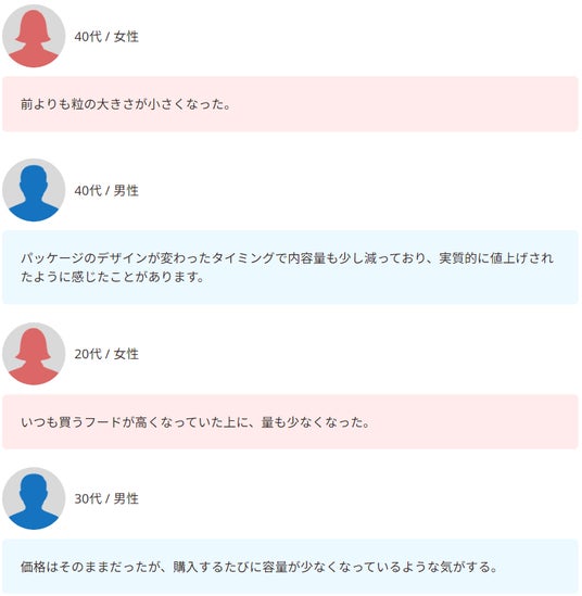「内容量は変わらないのに…」といった不満の声も目立ちました。
