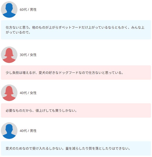 多くの人が、他の物価上昇を踏まえ、ドッグフードの値上げも“時代の流れ”として受け止めているようです。