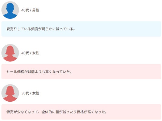 「セールが減った」「特売の割引率が低くなった」といった声も多かったです。
