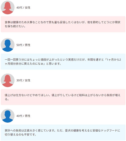 ドッグフードの値上げに対しては、先行きへの不安や不満の声も多く寄せられました。