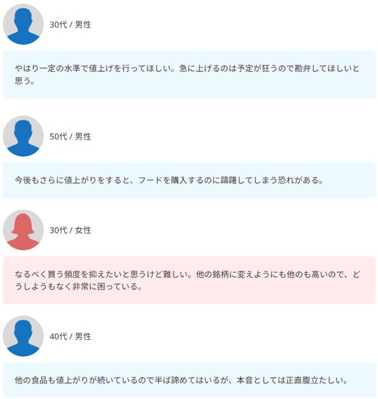 一方で、価格上昇を負担に感じる声も少なくありません。それでも「必要なものだから」「愛犬が気に入っているから」と、自分なりに納得しながら購入を続ける姿が見られました。