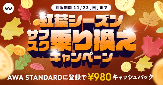 AWA株式会社(本社:東京都港区、代表取締役CEO:冨樫晃己)が運営する、サブスクリプション型(定額制)音楽ストリーミングサービス「AWA(アワ)」は、2025年11月12日(水)より、AWA STANDARD 月額プランへのご登録者全員を対象に、¥980キャッシュバックキャンペーンを開催いたします。