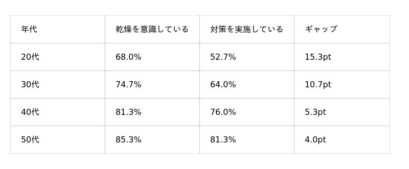 一方、40代以降では意識率と実施率のギャップが縮小し、50代では81.3%が対策を実施していると回答しており、年齢とともに肌ケアへの取り組みが具体的な行動に結びついている傾向が見られました。