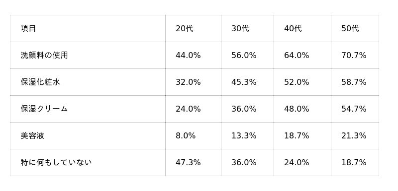 また、年代が上がるにつれてスキンケア実施率が向上する傾向も確認され、世代間での"肌ケア格差"が顕著に表れる結果となりました。