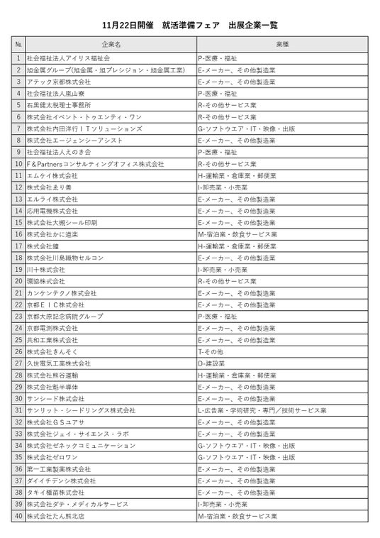 ■京都府では、今冬から春にかけてオープンカンパニー※やインターンシップの受け入れを希望する京都企業60社が出展し、説明会等を実施する「就活準備フェア」を11月22日に開催します。