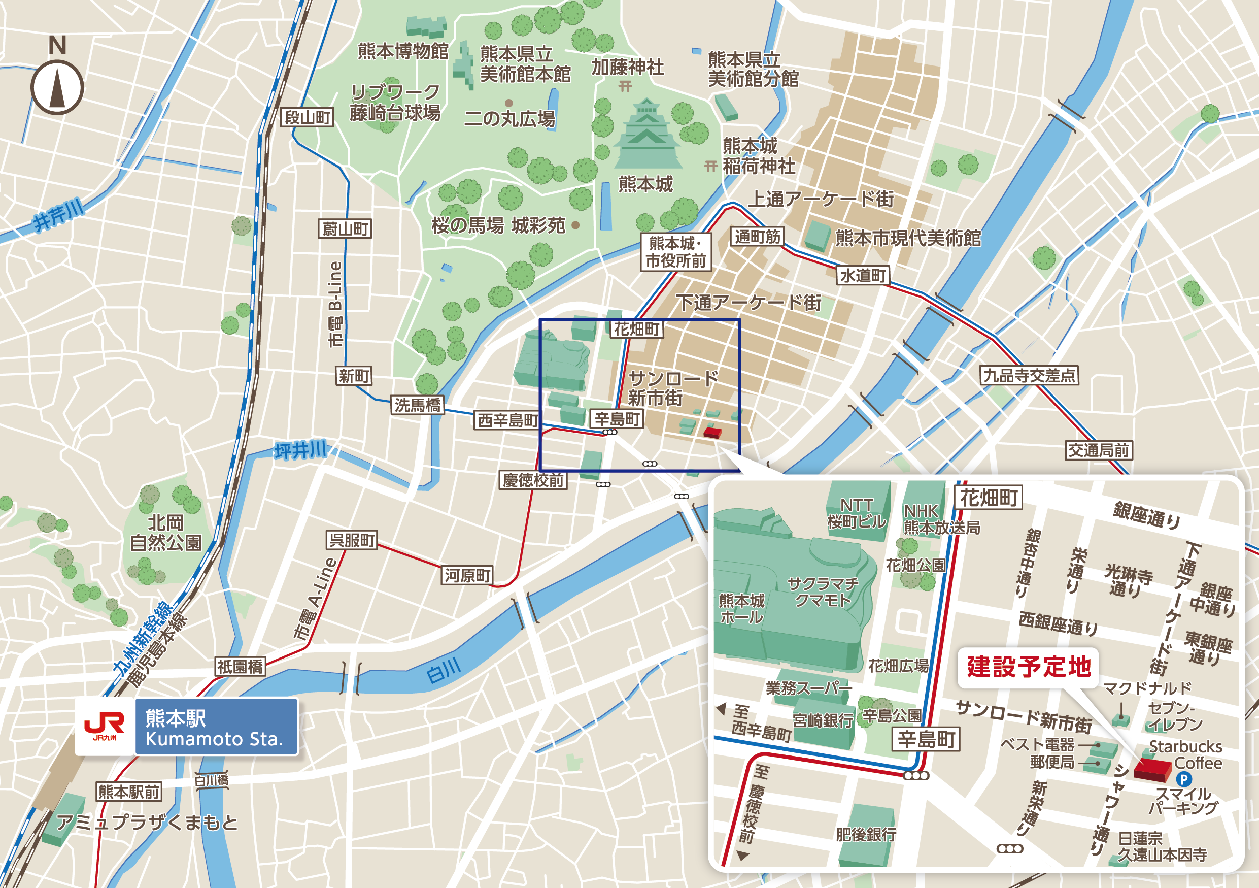 計画地は、「JR熊本」駅から徒歩すぐの熊本市電「熊本駅前」停留場から最寄りの「辛島町」停留場までは約15分、「辛島町」停留場からは徒歩約4分の立地であり、熊本市内最大となる繁華街「下通エリア」に位置しています。また、九州最大級のバスターミナル「熊本桜町バスターミナル」も近接しており、熊本城へも徒歩約15分と、市内観光やビジネスにも利便性の高い場所です。