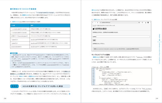 本書では、Webアプリで頻出する脆弱性について、それぞれ「概要」「攻撃手法」「原因」「対策」の4ステップで解説しています。各章では、SQLインジェクション、クロスサイトスクリプティング(XSS)、OSコマンドインジェクション、HTTPヘッダインジェクション、クロスサイトリクエストフォージェリ(CSRF)、パストラバーサル、XML外部エンティティ(XXE)など、実務で遭遇しやすい脆弱性を題材に、学習用アプリケーション「DSCLab(通称:やられアプリ)」を使って実際に検証できます。